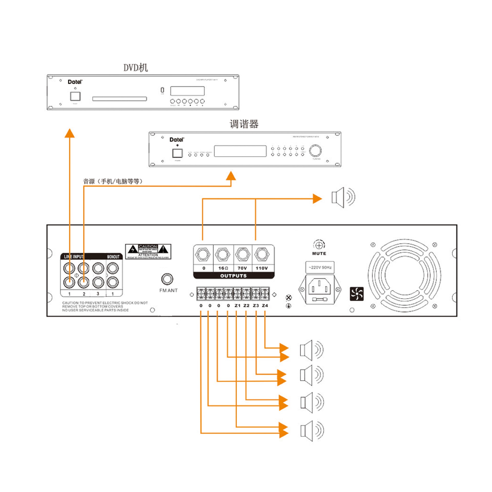 ■ 2通道麦克风输入,2通道Line线路输入,自带一通道MP3播放器,带1路线路输出。