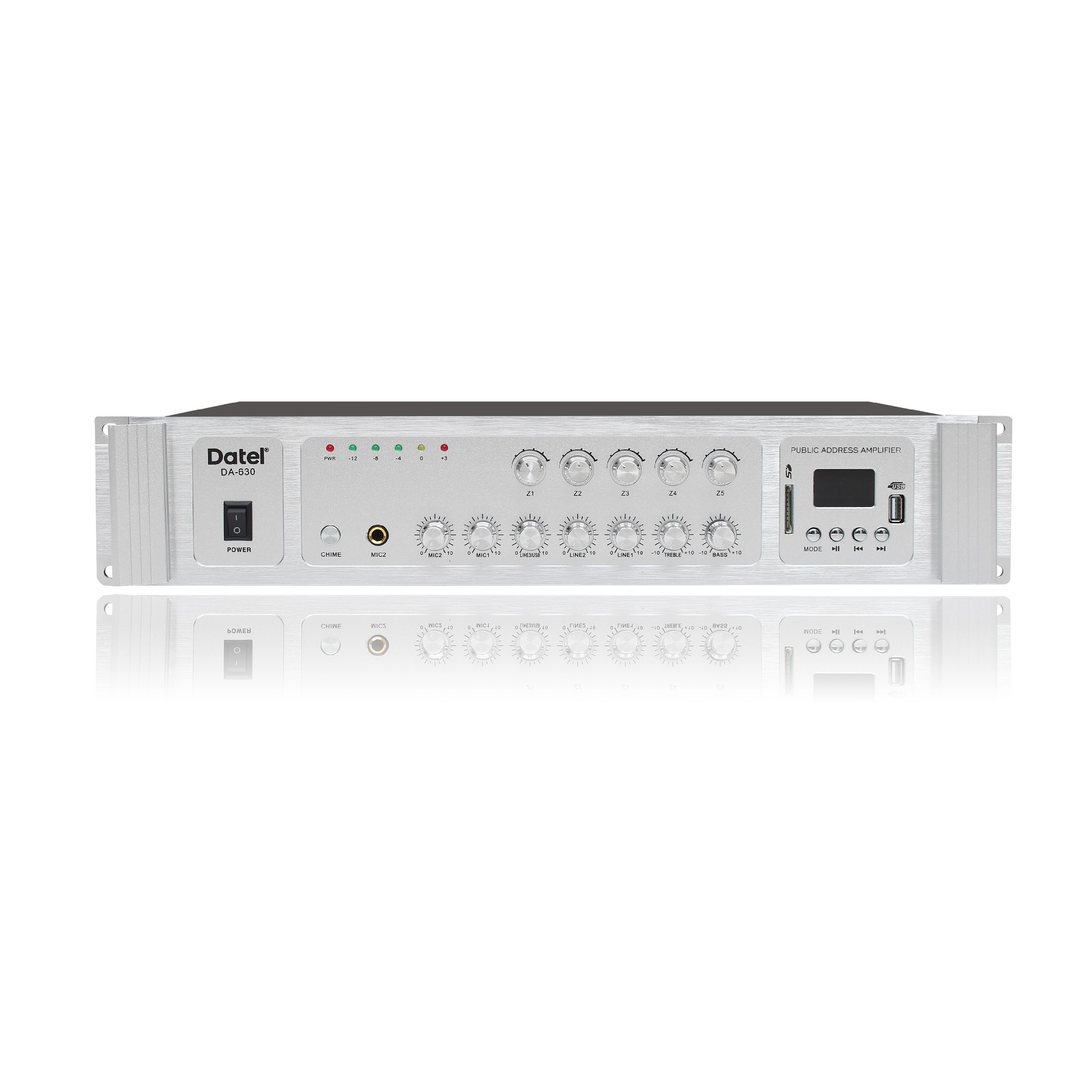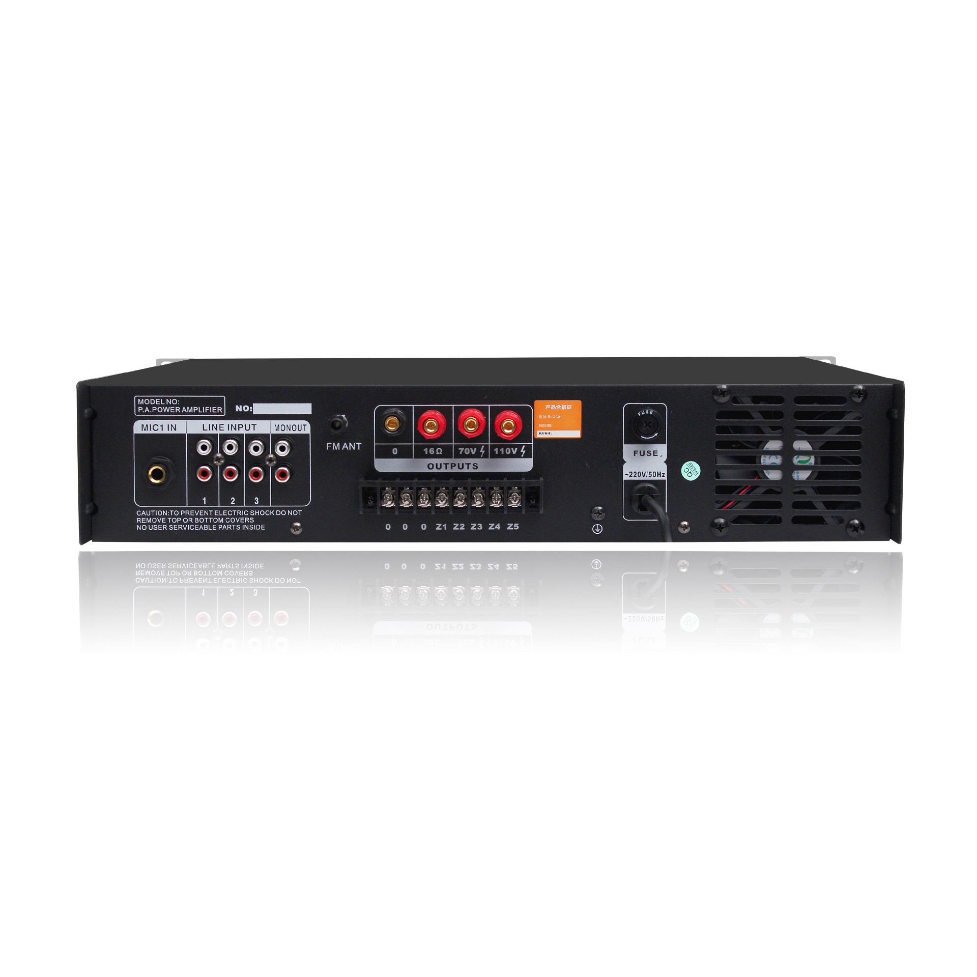 带五分区前置带蓝牙,MP3播放,专业广播功率放大器为广播系统提供区域功率放大,适用于大、中、小型场所的广播扩声。■ 带蓝牙4.0、USB及SD卡音乐播放■ 2通道麦克风输入,2通道Line线路输入,自带一通道MP3播放器,带1路线路输出。■ 麦克风1具有优先功能,深度通过电位器可调节。■ 4升调+4降调提示音按键。■ 每一路输入音量有单独调节按钮和高音、低音音量调节按钮。■ 设备具有良好的短路、过载、过热等自我保护,散热风机温控启动及关闭功放温度实时监控,温控增益智能调节,高温下增益自动下调,温度越高下调力度越大使整机工作更加稳定。■ 2种功率输出方式:定压输出110V、70V和定阻输出4~16Q■ 五路时序分区输出(110V),可独立旋钮调节音量,实现分区独立播放■ 十级三段色电平指示灯。
